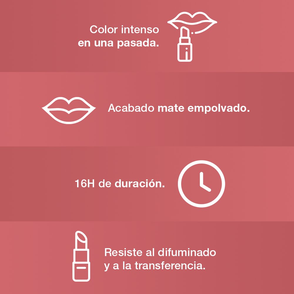 Labial líquido con acabado mate para tener un color duradero hasta por 16 horas. Fórmula con ácido hialurónico para una sensación cómoda y ligera en los labios.