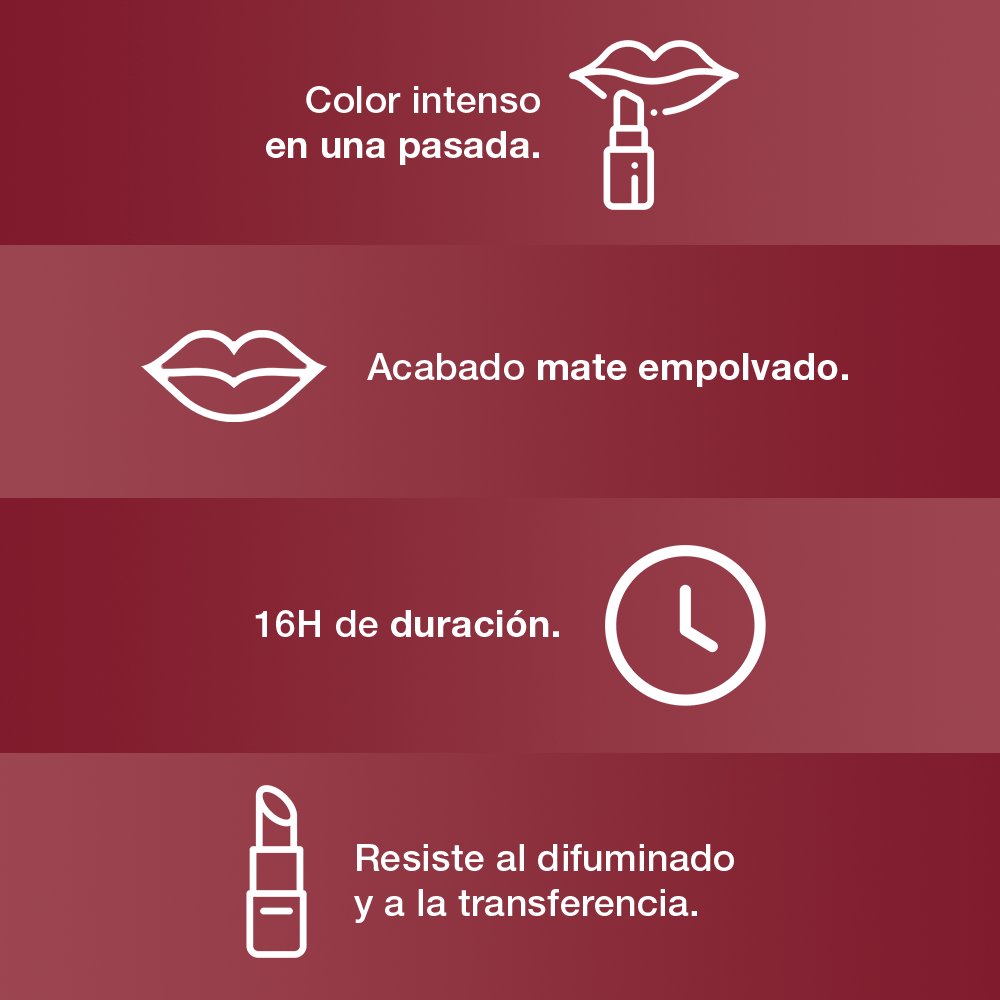 Labial líquido con acabado mate para tener un color duradero hasta por 16 horas. Fórmula con ácido hialurónico para una sensación cómoda y ligera en los labios.