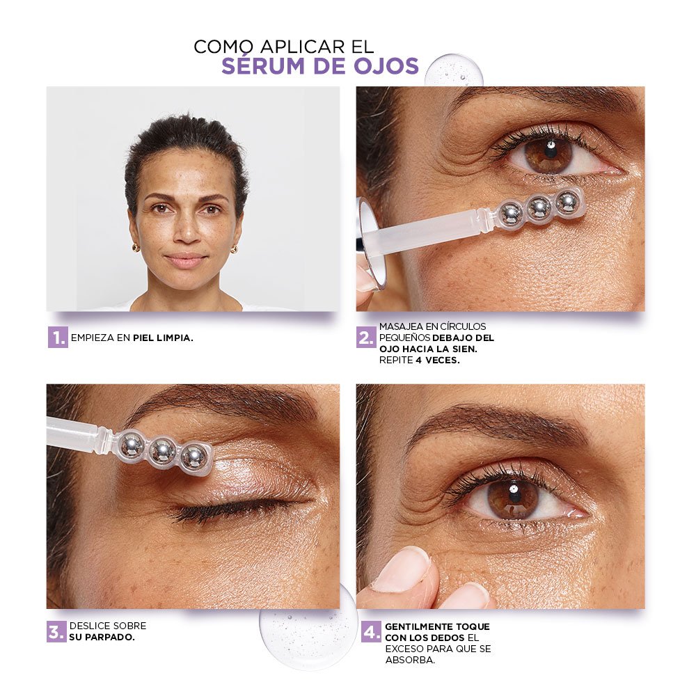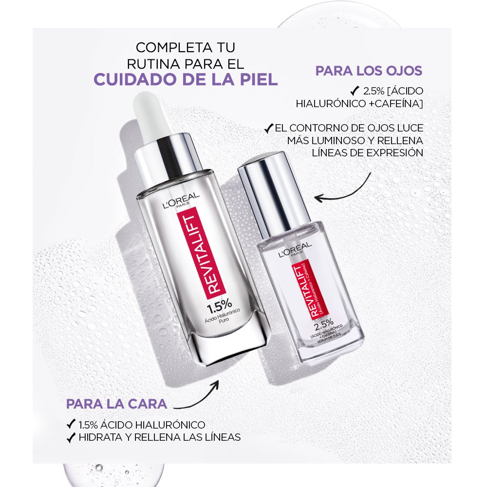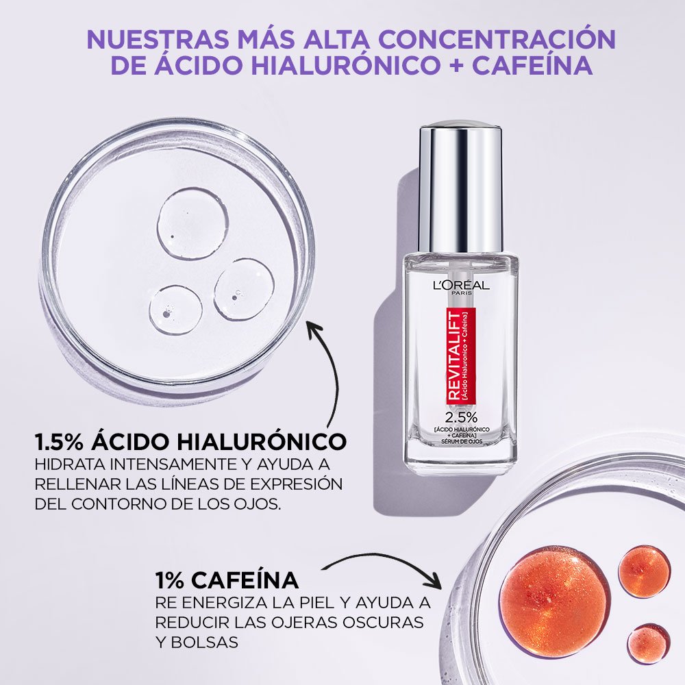Serum de ojos formulado con la concentración más alta de L'Oréal Paris de ácido hialurónico puro al 1.5% y 1% de cafeína pura. Revitaliza los ojos y reduce la apariencia de las ojeras inmediatamente, mientras hidrata y rellena las arrugas en el área de los ojos con el tiempo. En 2 semanas los ojos lucen 5 años más jóvenes. *Estudio aplicado a 81 mujeres con 2 semanas de uso. NSOC00287-22EC